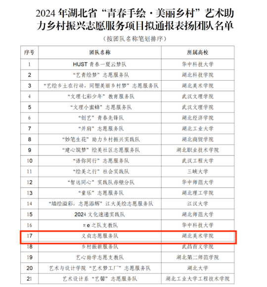 经湖北省志愿者协会组织发动,2024年暑期,共有来自省内59所高校的145支团队参与实施“青春手绘·美丽乡村”艺术助力乡村振兴志愿服务项目。经过材料审核、专家评审、组织复核,williamhill威廉希尔官网义贞志愿服务队作为优秀志愿服务团队获湖北省志愿者协会通报表扬。